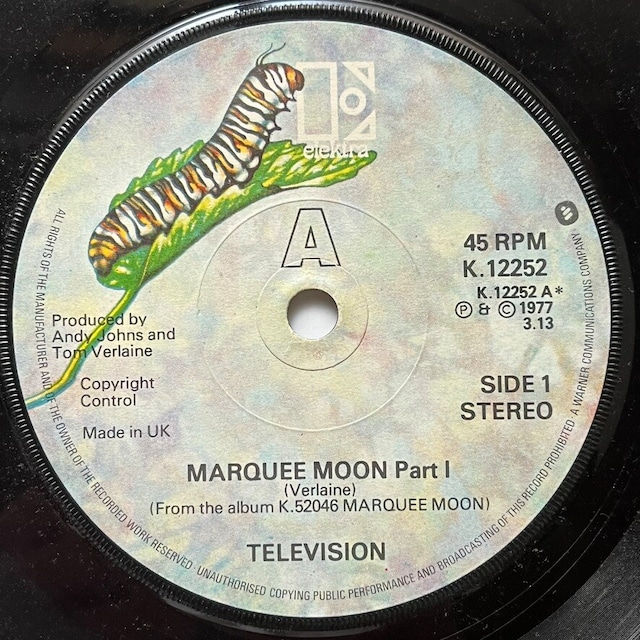 Tom Verlaine 率いる 70's ニューヨーク・パンクを代表するバンド、Television の1977年リリース作。 ギターリフ、ベース、ドラムと徐々に重なっていくイントロ、ツインギターとヴォーカルの絡みが完璧と言っても良い大名曲。 A : Marquee Moon Part I B : Marquee Moon Part II 7inch / Elektra / UK / 1977 Media : VG+, Sleeve : White 試聴はこちらから https://www.instagram.com/p/DUH6wi_Ej9w/ https://www.instagram.com/p/DUH6xnsEs-U/